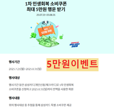 삼성카드 자체적으로 민생회복 소비쿠폰 삼성카드 신청 및 사용 고객에게 별도의 추가 포인트나 캐시백 혜택을 제공하는 경우가 있습니다. 이는 카드사 프로모션에 따라 달라질 수 있으므로, 신청 전에 반드시 삼성카드 홈페이지나 앱의 이벤트/공지사항을 확인하는 것이 중요합니다. (현재 "최대 5만원 행운받기" 이벤트 진행중)